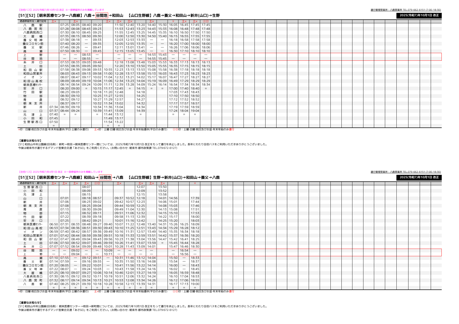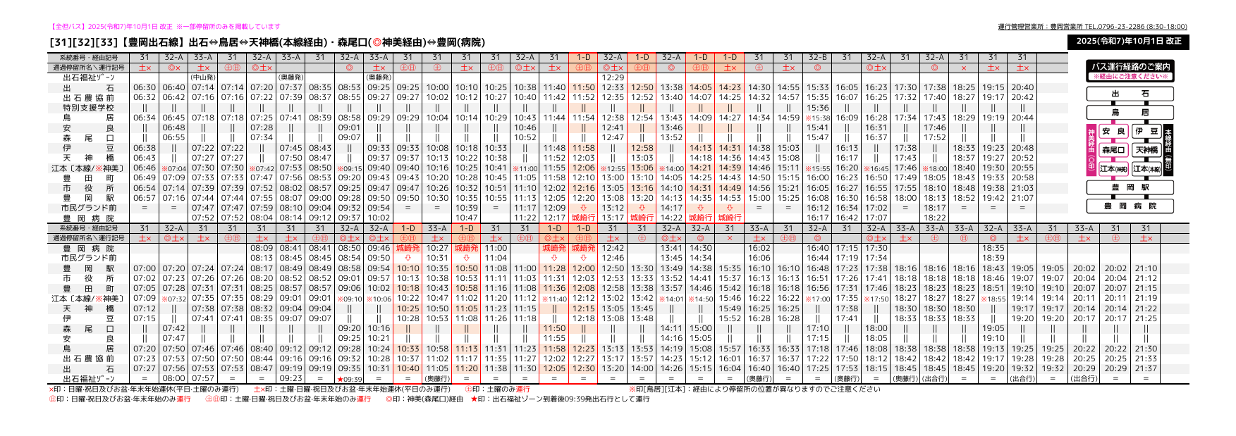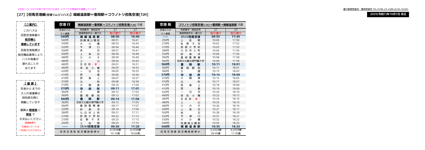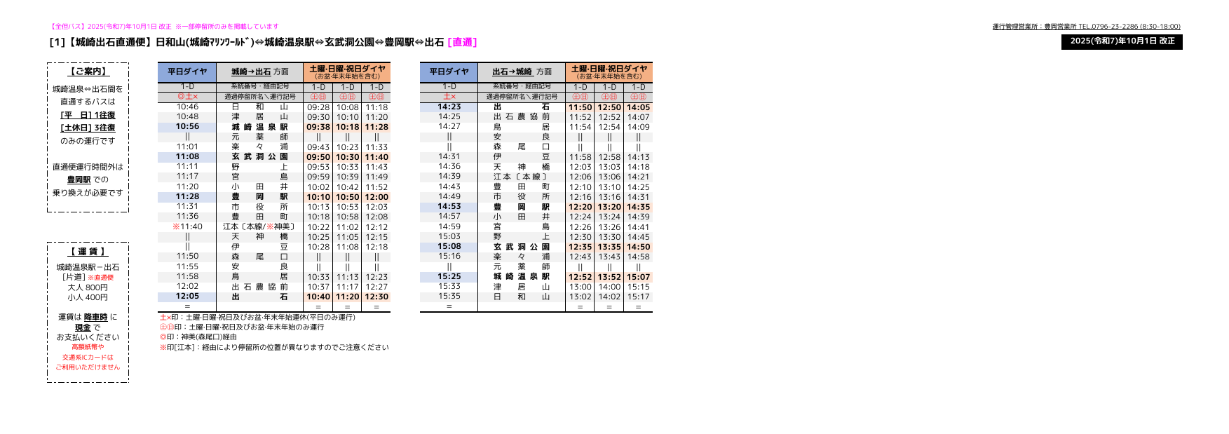 【重要なお知らせ】 [51] 和田山中央公園線(旧名称):新町~枚田~朝来医療センター間については、2025(令和7)年10月1日改正をもって運行を休止しました。 長年にわたり全但バスをご利用いただきありがとうございました。 |