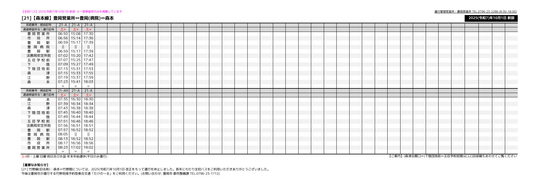 【重要なお知らせ】 [21] 竹野線(旧名称):森本~竹野間(竹野町内区間)については、2025(令和7)年10月1日改正をもって運行を休止しました。 長年にわたり全但バスをご利用いただきありがとうございました。 |