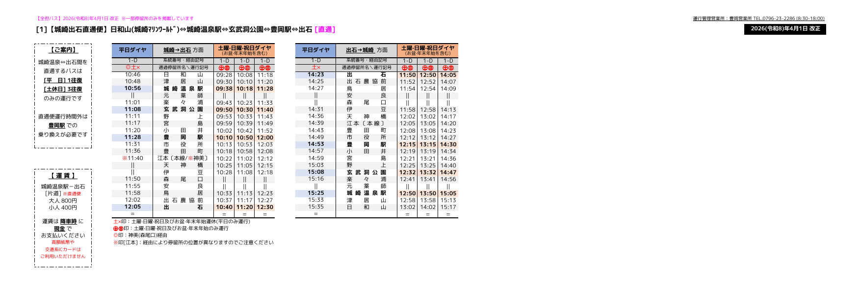 [運行区間]日和山(マリンワールド)~城崎温泉駅~玄武洞駅~豊岡(駅/病院)~江原河畔劇場~八鹿駅~但馬農高
