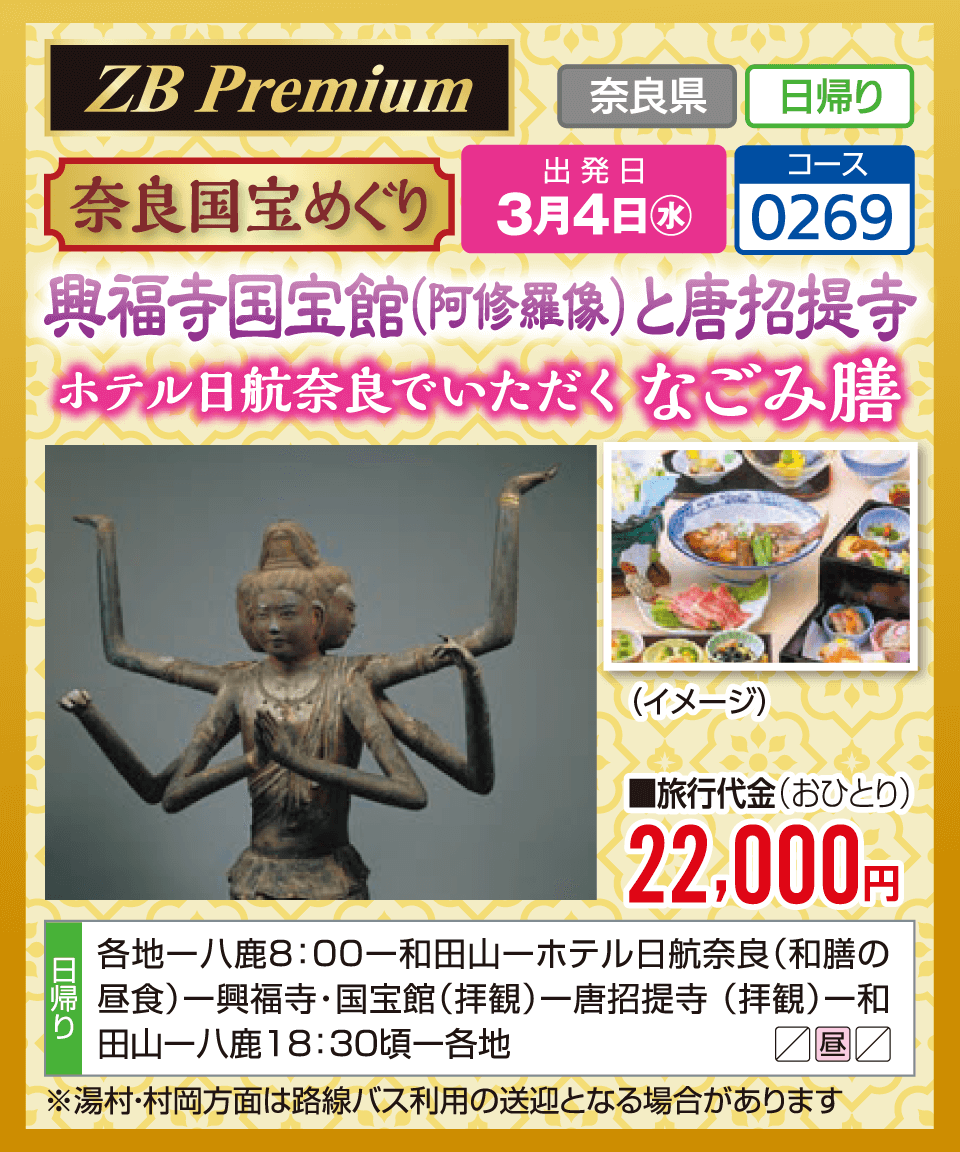 【ZB Premium】奈良国宝めぐり 興福寺国宝館(阿修羅像)と唐招提寺 ホテル日航奈良でいただく なごみ膳
