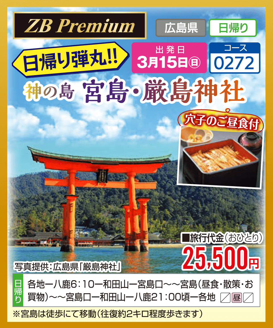 【ZB Premium】日帰り弾丸!! 神の島 宮島・厳島神社 穴子のご昼食付