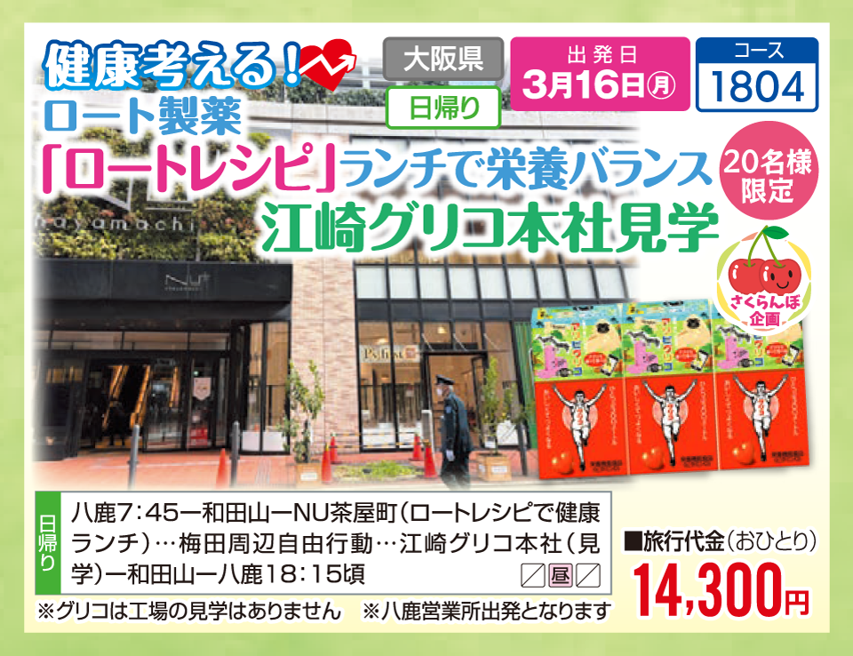 【20名様限定】健康考える!ロート製薬「ロートレシピ」ランチで栄養バランス 江崎グリコ本社見学【さくらんぼ企画】