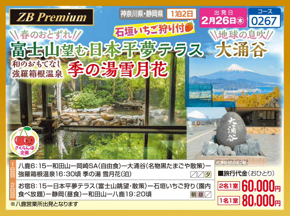 【ZB Premium】富士山望む日本平夢テラス 大涌谷 和のおもてなし 強羅箱根温泉 季の湯雪月花 石垣いちご狩り付【さくらんぼ企画】