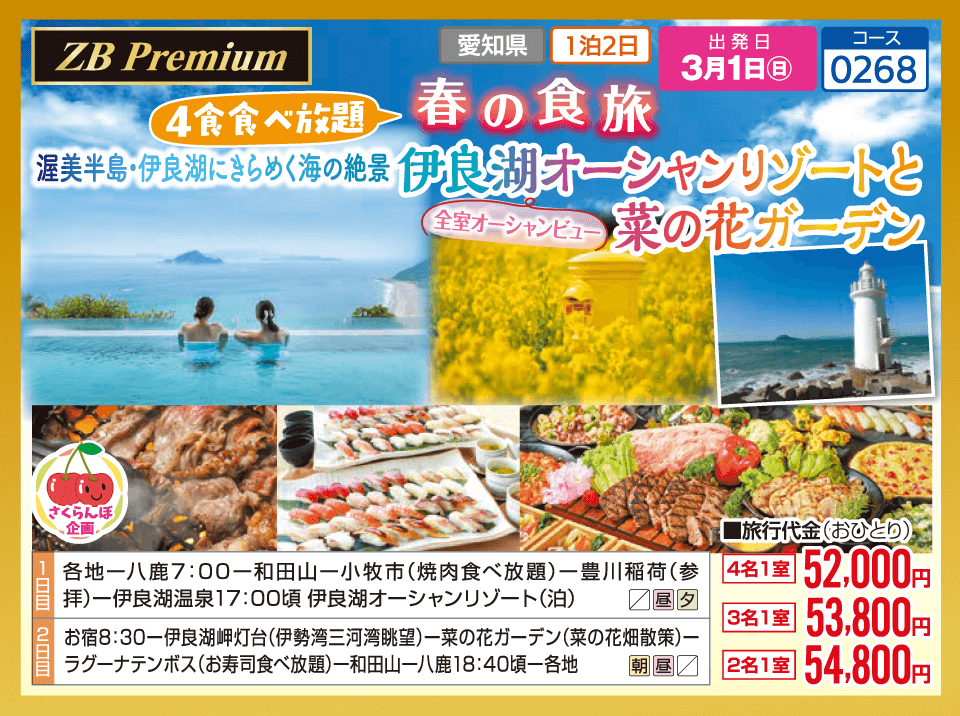 【ZB Premium】4食食べ放題 春の食旅 渥美半島・伊良湖にきらめく海の絶景 伊良湖オーシャンリゾートと 全室オーシャンビュー 菜の花ガーデン【さくらんぼ企画】